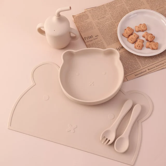 5-Piece Silicone Baby Feeding Set with Bear Plate, Bowl, Spoon, Fork & Cup
