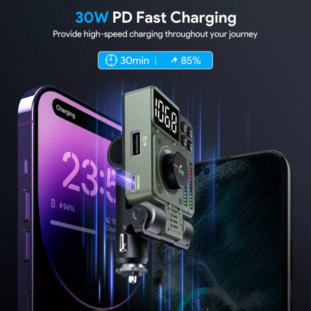 Transform your car rides with the Bluetooth 5.3 FM Transmitter, a powerhouse of innovation designed to keep you connected, entertained, and fully charged on the go. Whether you’re commuting, road-tripping, or just cruising around town, this device ensures superior sound quality, effortless hands-free calling, and rapid device charging, all in one sleek and compact unit.