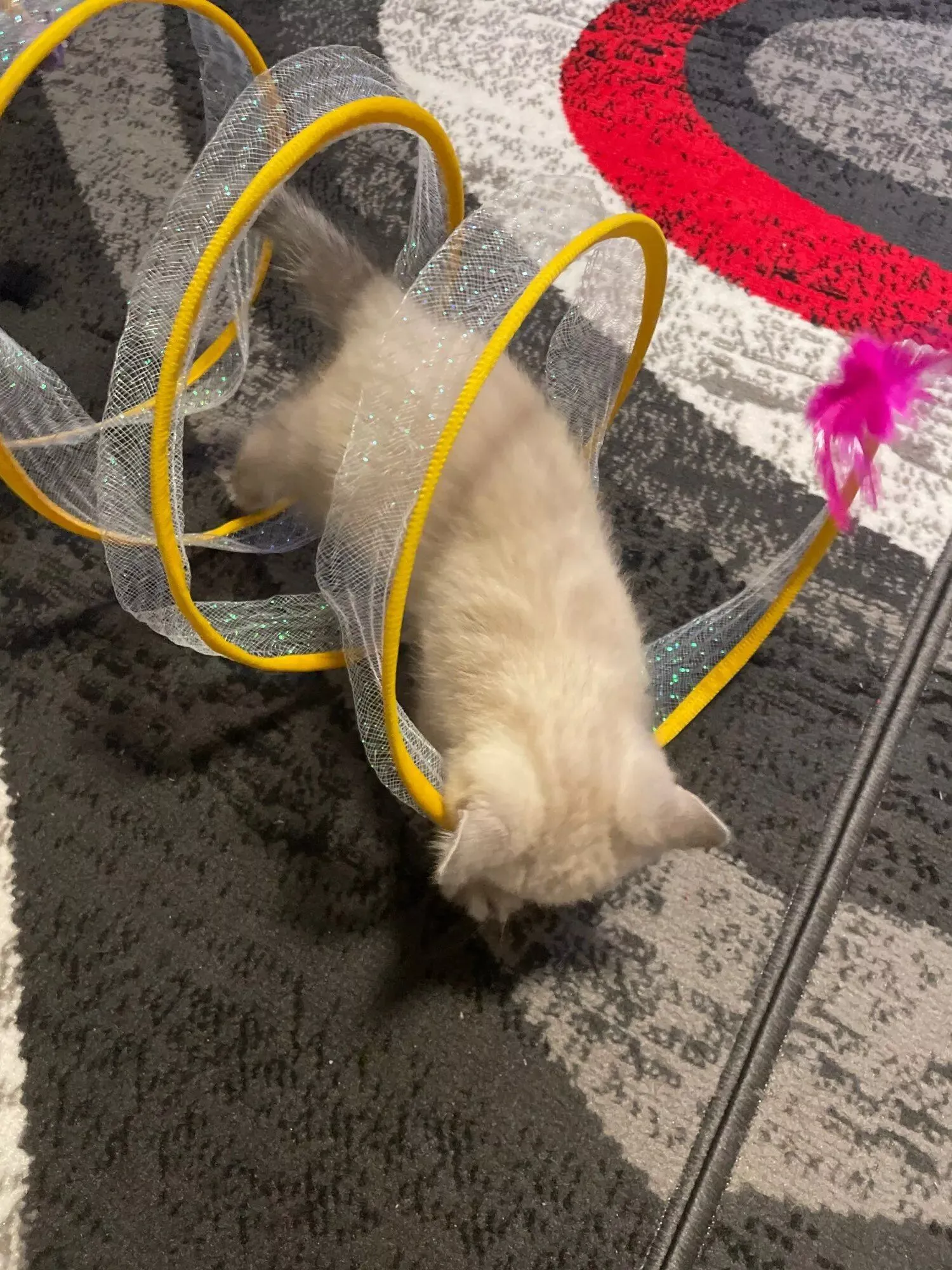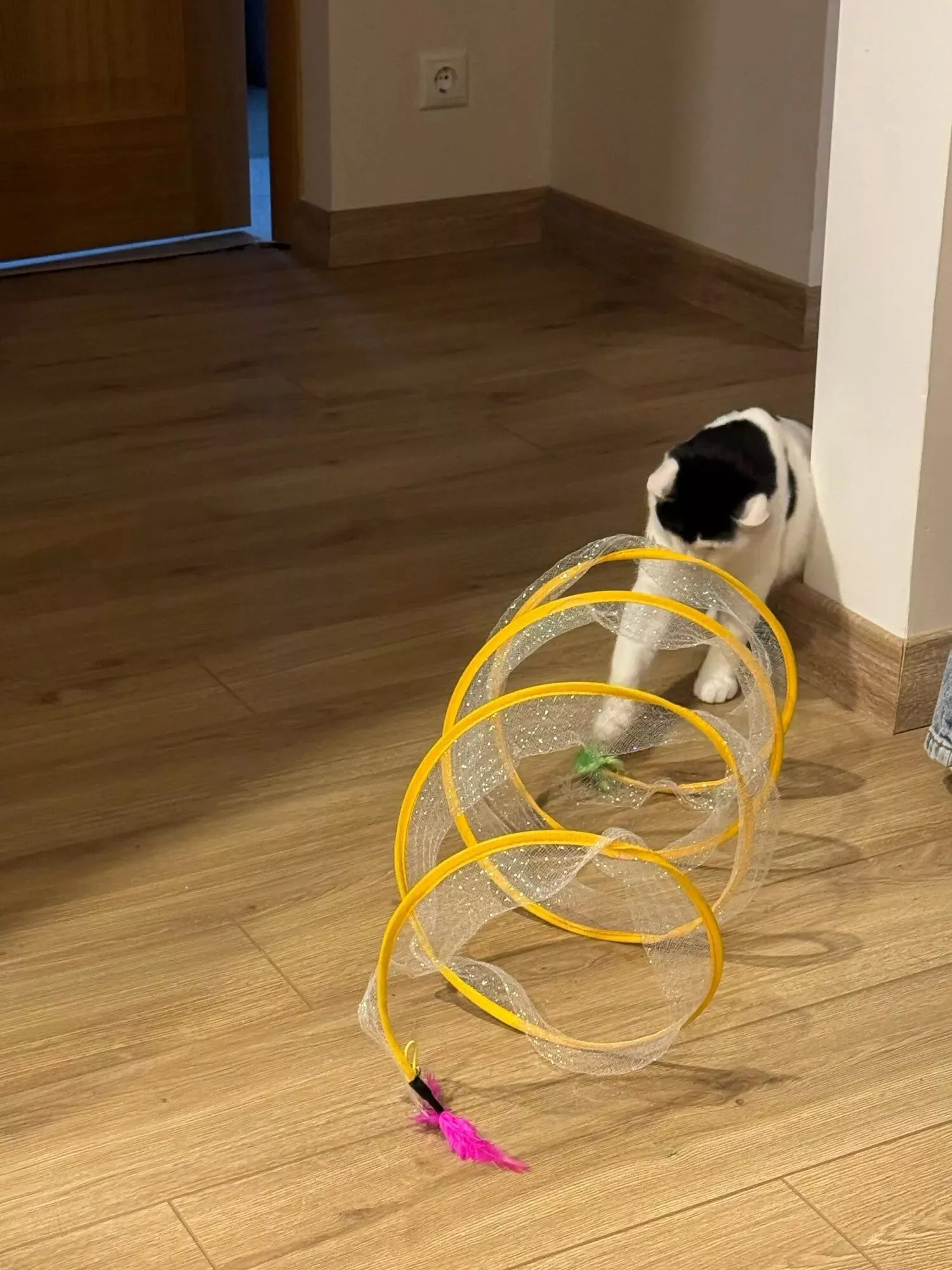 Our kitten likes to play with the toys. Within 1 night she had already got a feather loose.🙈