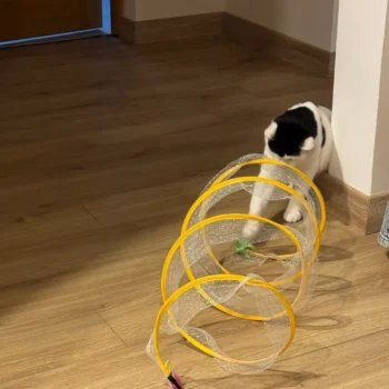 i’m really pleased with this cat tunnel. my cats absolutely love it. the crinkly fabric is a big hit and they enjoy running through it and hiding. it’s well-made and sturdy, and the setup was quick and easy. it’s also lightweight and easy to move around, which is great. the tunnel folds up nicely when not in use, saving space. my cats are more active and playful now. this tunnel has definitely added a lot of fun to their playtime. highly recommend it for anyone with cats.