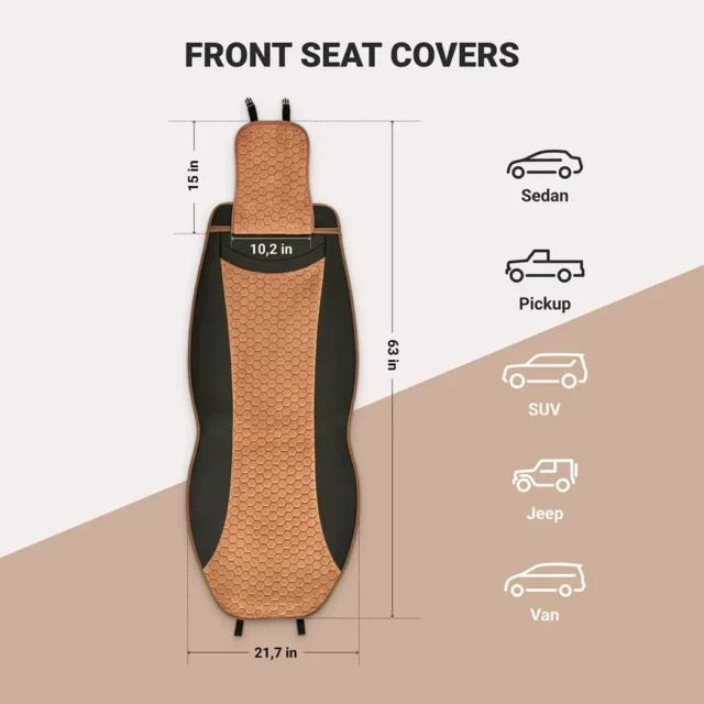 got this front and back seat car seat covers set and it’s been fantastic. the covers fit snugly on my seats and look very stylish. installation was quick and easy, taking only a few minutes. the material is high-quality and durable, yet comfortable to sit on. these covers have been great at protecting my seats from spills, stains, and daily wear and tear. they’re also very easy to clean – just wipe them down and they look good as new. i’ve noticed a big improvement in the overall look and comfort of my car’s interior. these covers have really made a difference, especially on long drives. they’ve held up well with regular use and still look great. i highly recommend this set to anyone looking for good-quality, stylish seat covers.