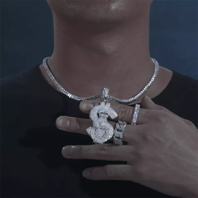 Moissanite Dollar Sign Pendant Necklace for Men and Women – 925 Sterling Silver Iced Out Hip Hop Jewelry