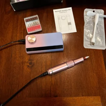 i recently purchased this rechargeable nail drill manicure machine and it has exceeded my expectations. the drill is powerful yet gentle on my nails, making it perfect for both beginners and professionals. the rechargeable feature is incredibly convenient, eliminating the hassle of cords and providing great portability. the battery life is impressive – it lasts through multiple manicure sessions before needing a recharge. the drill comes with a variety of attachments that are all high-quality and versatile, making it easy to shape, smooth, and buff my nails. the multiple speed settings allow for precise control, ensuring a professional-looking finish every time. the drill is also very quiet and doesn’t heat up, which makes it comfortable to use for extended periods. i’ve saved so much time and money doing my nails at home with this machine. it’s a fantastic investment for anyone who loves having beautifully manicured nails. highly recommend this product.
