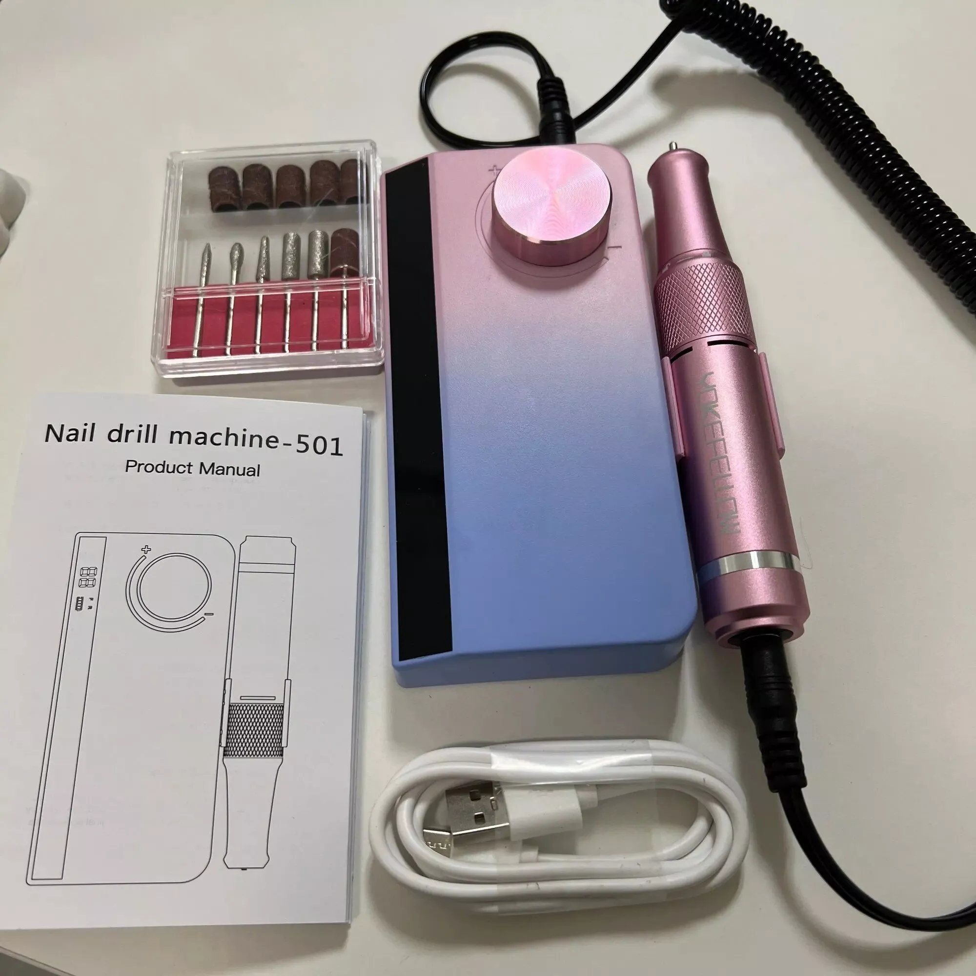 My wife, an avid DIY dip powder manicure enthusiast for nearly two years, has experimented with various drills but finds this one exceptional, especially adoring its unicorn/mermaid color gradient. The package is comprehensive, including a wide range of accessories and the convenience of a rechargeable design. The digital display and memory feature for speed settings enhance its user-friendliness. The included USB fan and flashlight, with their adjustable positions, add to its appeal, making manicure sessions more enjoyable even during our TV time, thanks to the bright and useful flashlight. The fan's strength is impressive for its size, and while the device has a single USB port, limiting simultaneous accessory use, it's a unique feature not found in her other drills. She highly recommends this drill for its distinctive features and overall quality.