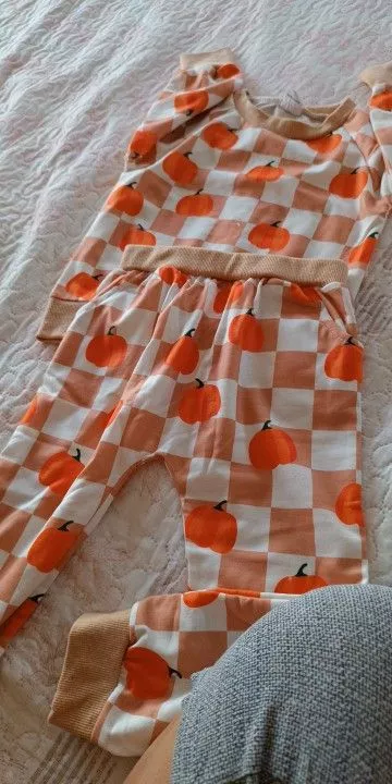 Crafted from 100% polyester, the soft fabric ensures your toddler stays comfortable all day long. The crew neck sweatshirt and elastic waist pants are designed for easy movement, giving your child the freedom to play, run, and explore without any restrictions. The eye-catching pumpkin and checkerboard design brings festive Halloween vibes, making it perfect for the season’s celebrations.