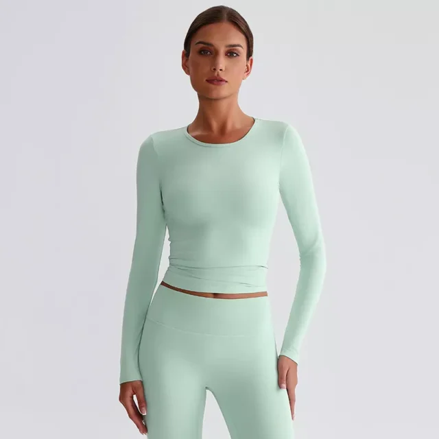This yoga crop top features a flattering round neckline and a cropped silhouette that complements your natural shape. With a slim fit and full-length sleeves, it’s ideal for layering or wearing solo. The breathable broadcloth knit fabric ensures you stay cool, dry, and focused, even through the most intense sessions.