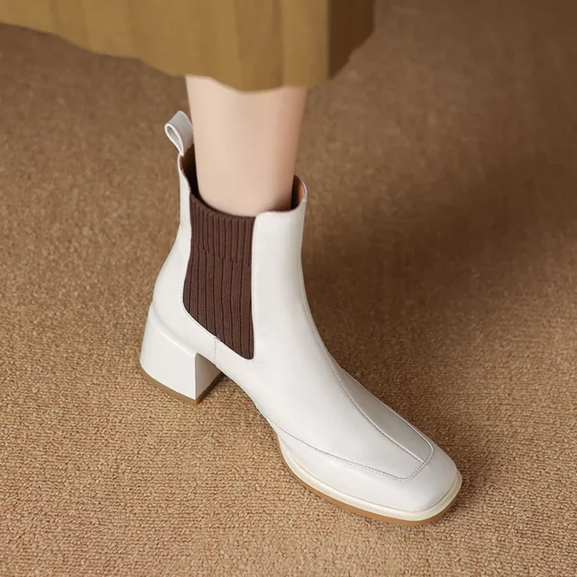Elevate your cold-weather wardrobe with these stunning women’s ankle boots. Designed with a chic square toe and a modern high block heel, these boots bring the perfect mix of elegance and comfort. Crafted from genuine leather with a plush interior lining, they keep your feet cozy while making a bold fashion statement. The easy slip-on elastic band design ensures a secure fit without the hassle of laces or zippers.